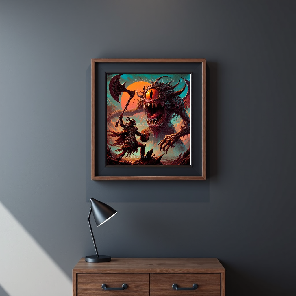 In a vivid clash of myth and monstrosity, this artwork encapsulates the eternal struggle between heroism and chaos. The formidable warrior stands valiantly against a monstrous creature, showcasing an intersection of bravery and dread. With bold colors and dramatic lighting, the piece draws viewers into its fantastical realm, inviting them to explore the tension and narrative woven into every brushstroke.